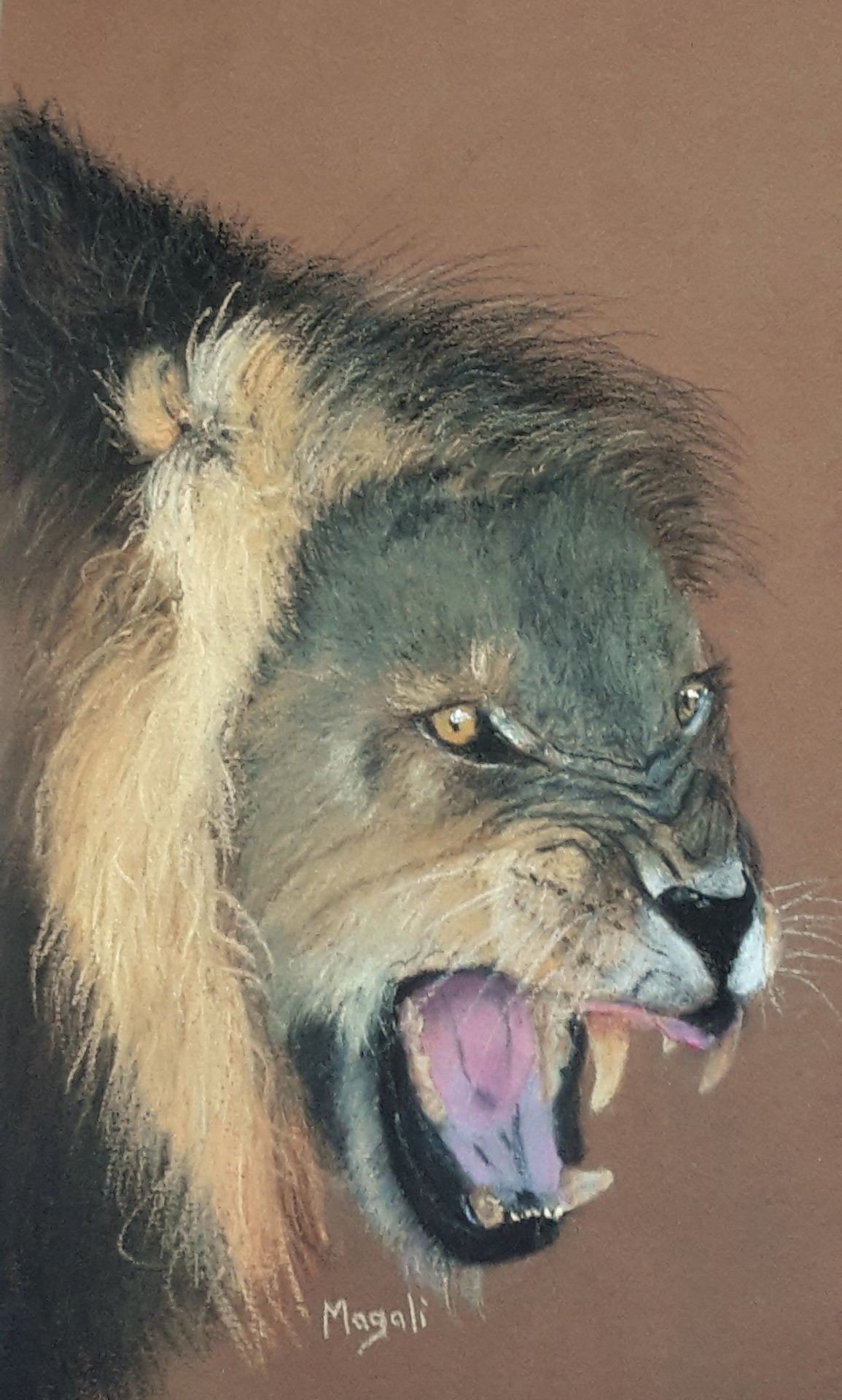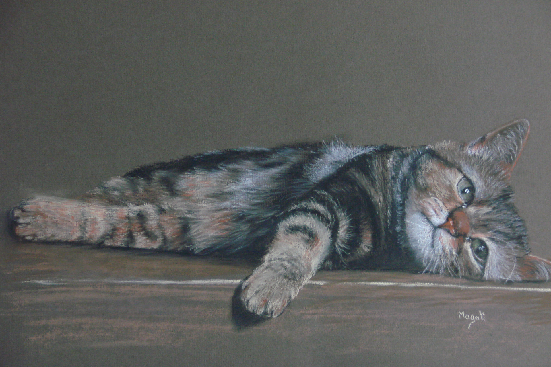 Pour mon travail sur l'animalier, je préfère la douce matière du pastel sec qui permet un travail plus sensuel. Les doigts et les bâtons caressent le papier et font naître principalement des félins".